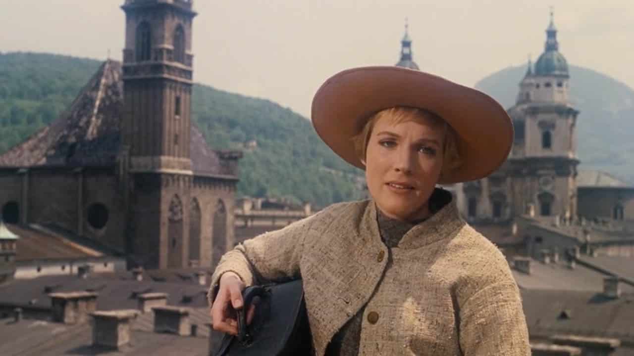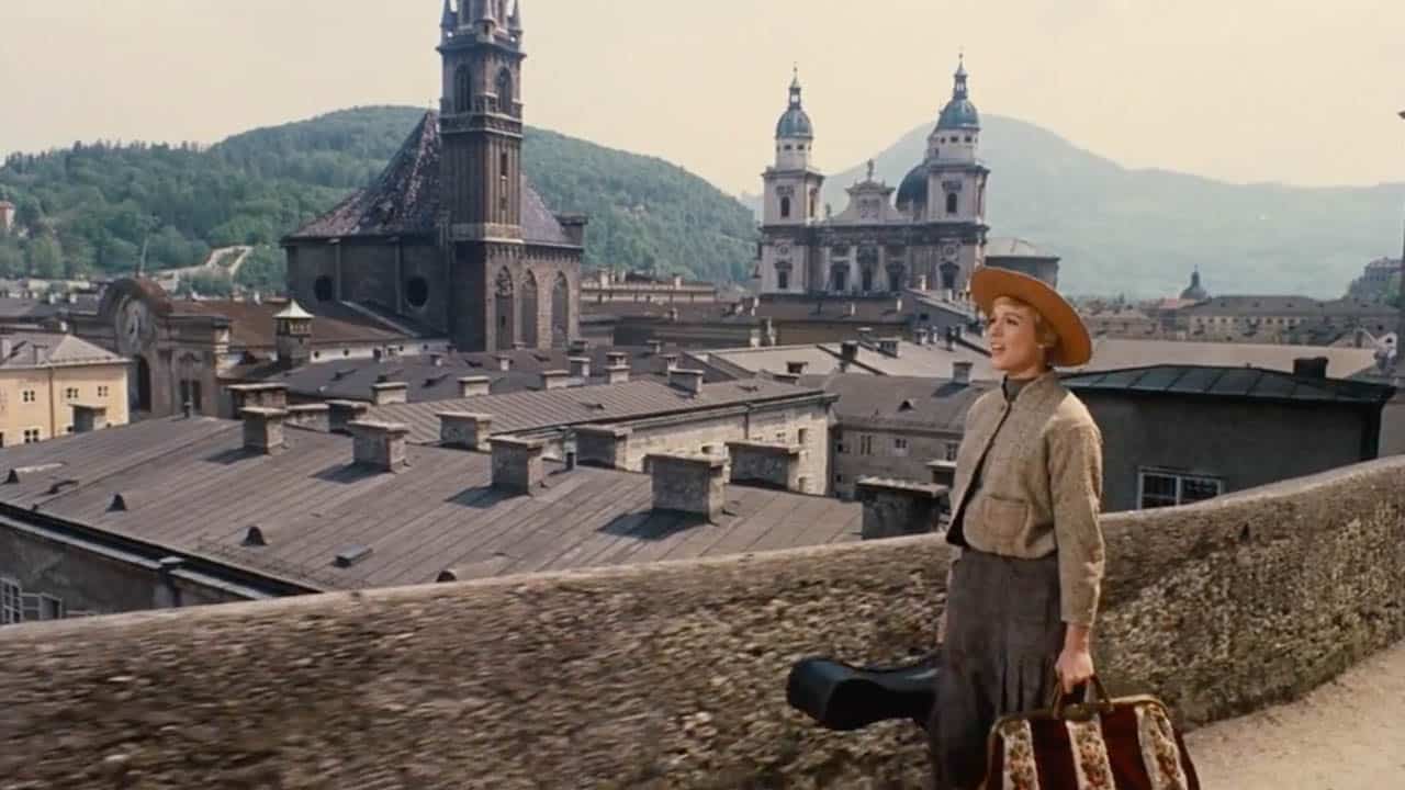 Maria (Julie Andrews), full of hope and trepidation, leaves the confines of Nonnberg Abbey. She ascends to a high point on the pathway, overlooking the historic town of Salzburg, Austria. The stunning panoramic view serves as a backdrop to her inner longing for adventure and the courage to face the unknown.