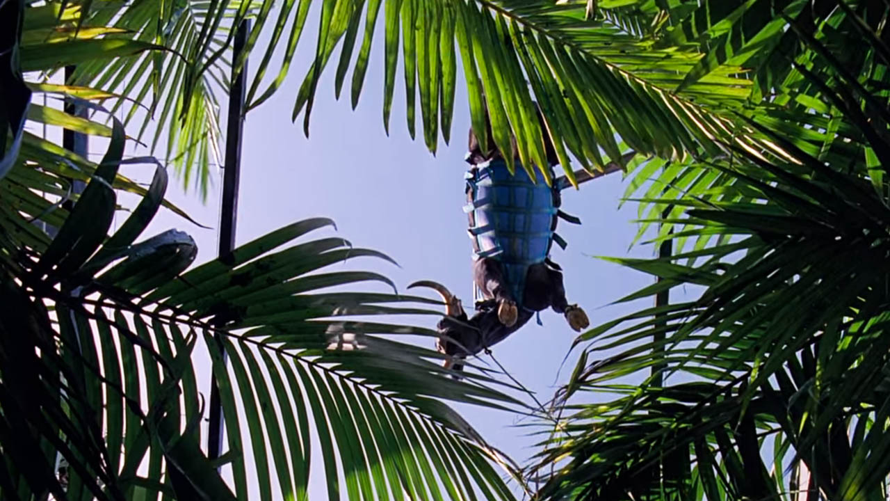 In this scene, Dr. Alan Grant (Sam Neill), Ellie Sattler (Laura Dern), and Donald Gennaro (Martin Ferrero) watch as a cow is lowered into the raptor enclosure for feeding. The scene is made more intense by the natural, beautiful, yet isolating environment provided by Limahuli Garden & Preserve.